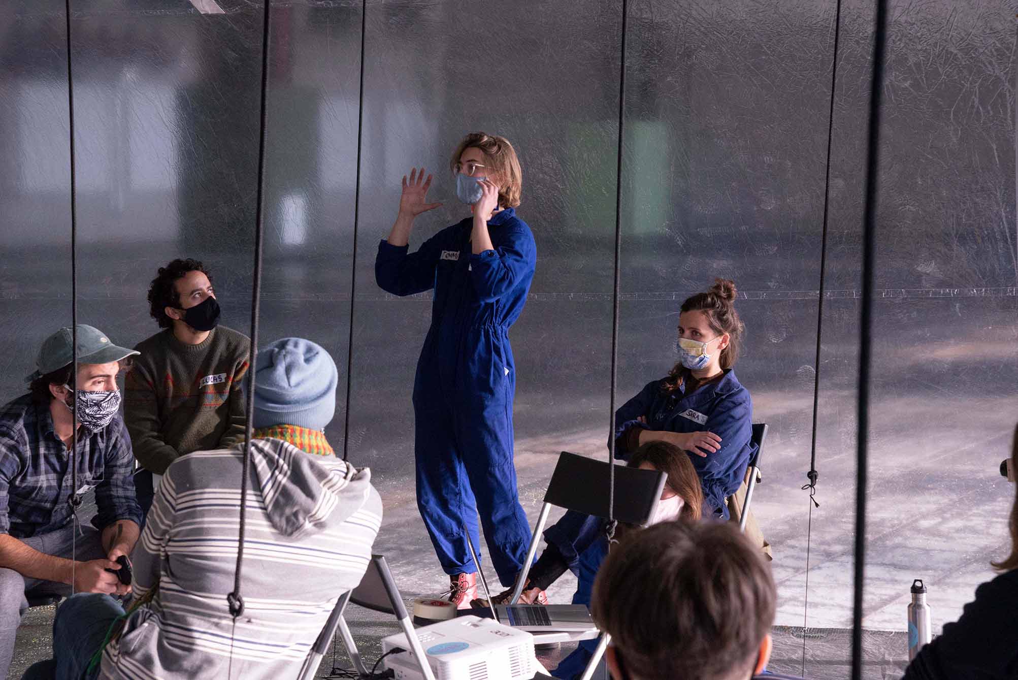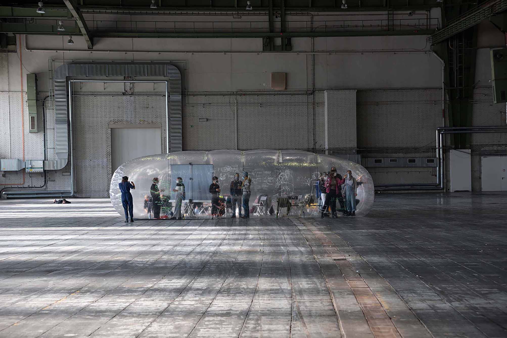 Über den Open Call kamen etwa 50 Einreichungen, mit unterschiedlichsten Ideen. Die interessantesten Projekte wurden eingeladen, sich an einem kollektiven Planungsprozess zu beteiligen, der Methoden kreativer Aneignung, Werkzeuge zur Selbstorganisation und Prototyping umfasste. Für den ersten Workshop baute das Popticum Collective eine aufblasbare Struktur, und wir zogen symbolisch in einen leeren Hangar ein. Die Hülle der Struktur wurde während des Workshops als Leinwand genutzt.